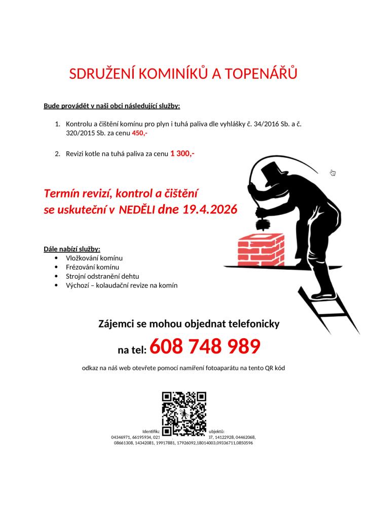 Kontroly a čištění komínů - 19. 4. 2026